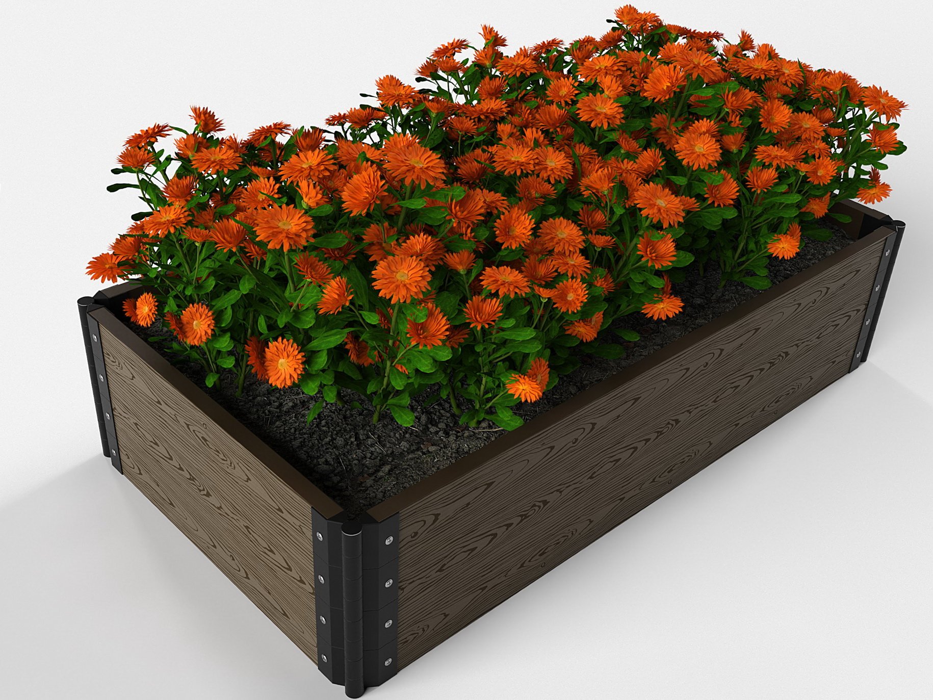 Конструкции цветочников и клумб из ДПК представляют собой высокие доски, которые соединяются между собой с помощью поворотных шарниров из прочного пластика. Обычно они выпускаются в стандартных размерах (30х300х2950 мм), но не исключается изготовление индивидуальных конструкций под заказ.